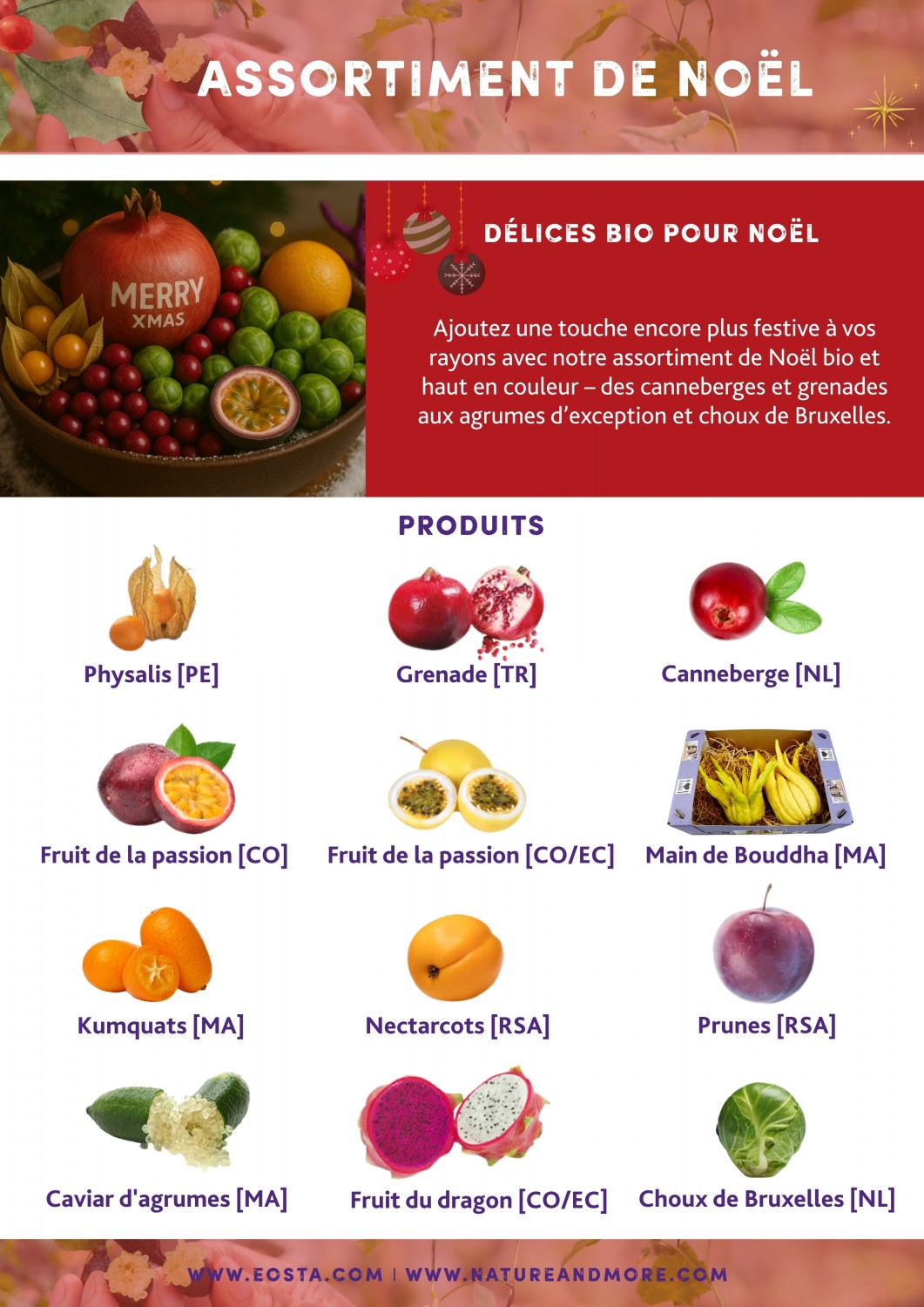 Les fêtes de fin d'année sont le moment idéal pour attirer l'attention avec des couleurs, des parfums et des expériences. Avec cette sélection, vous donnez à votre rayon fruits et légumes un aspect festif qui inspire les clients, des classiques hivernaux aux accents exotiques surprenants.