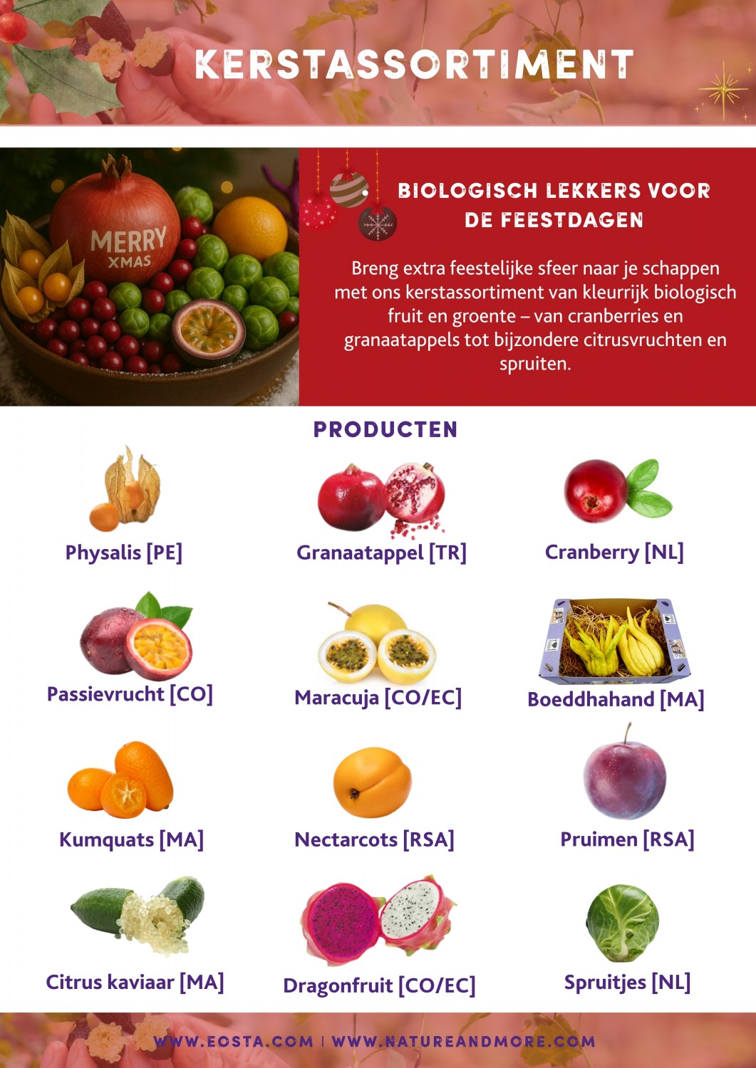 Die Feiertage sind der ideale Zeitpunkt, um mit Farbe, Duft und Erlebnis zusätzliche Aufmerksamkeit zu erregen. Mit dieser Auswahl verleihen Sie Ihrem Obst- und Gemüseregal eine festliche Ausstrahlung, die Kunden inspiriert – von Winterklassikern bis hin zu überraschenden exotischen Akzenten.