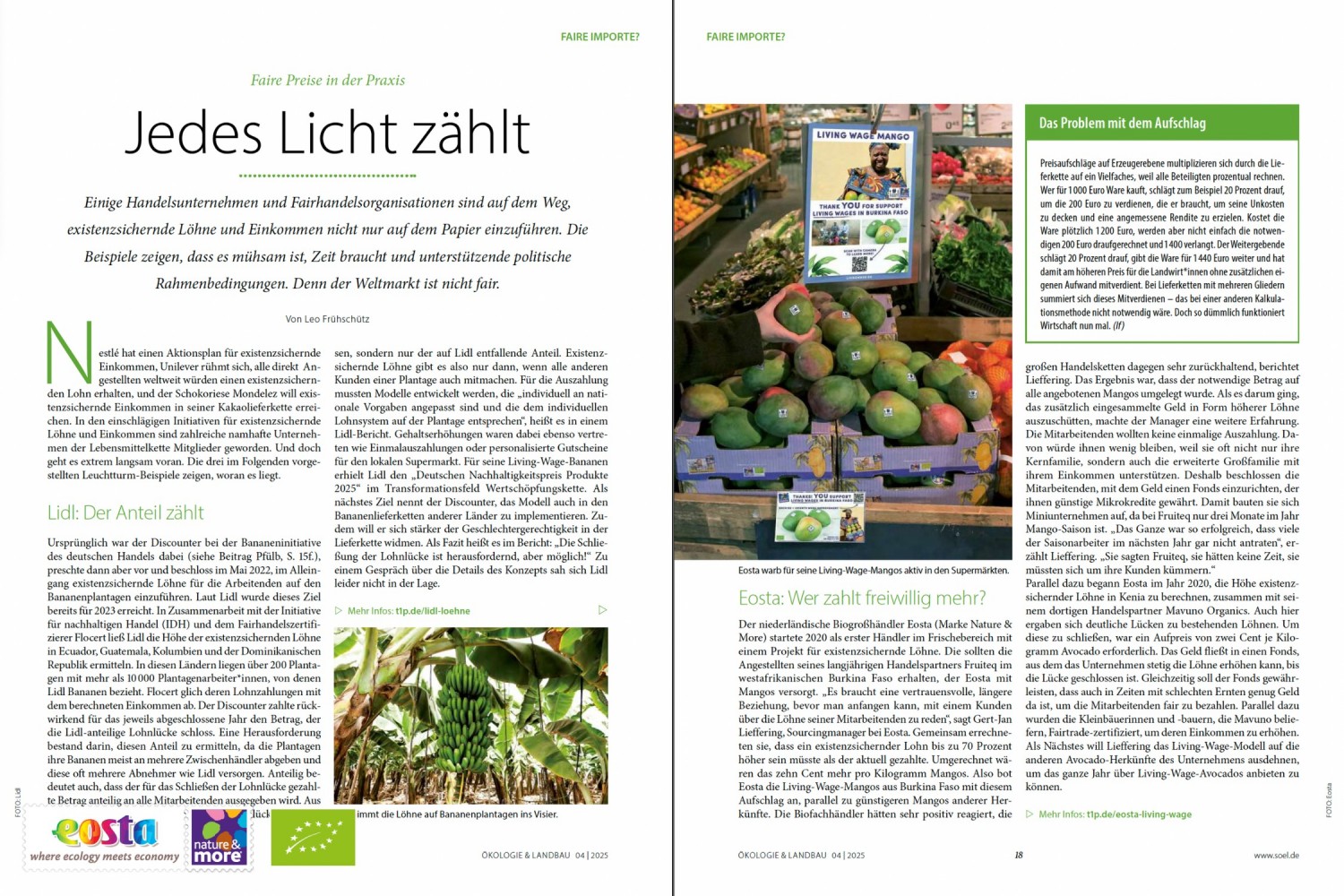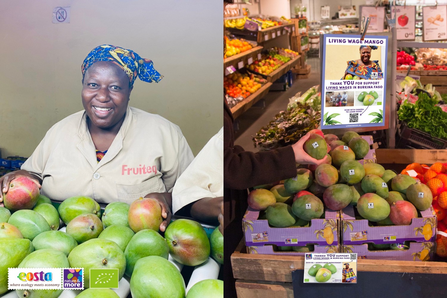 Während große Lebensmittelkonzerne wie Nestlé und Unilever vor allem Richtlinien für existenzsichernde Einkommen entwickeln, konzentriert sich Eosta seit 2020 auf die praktische Umsetzung in der Bio-Lieferkette. Als erster Frischwarenhändler startete Eosta in Zusammenarbeit mit seinem Partner Fruiteq ein konkretes Projekt für existenzsichernde Löhne mit Mangos aus Burkina Faso.