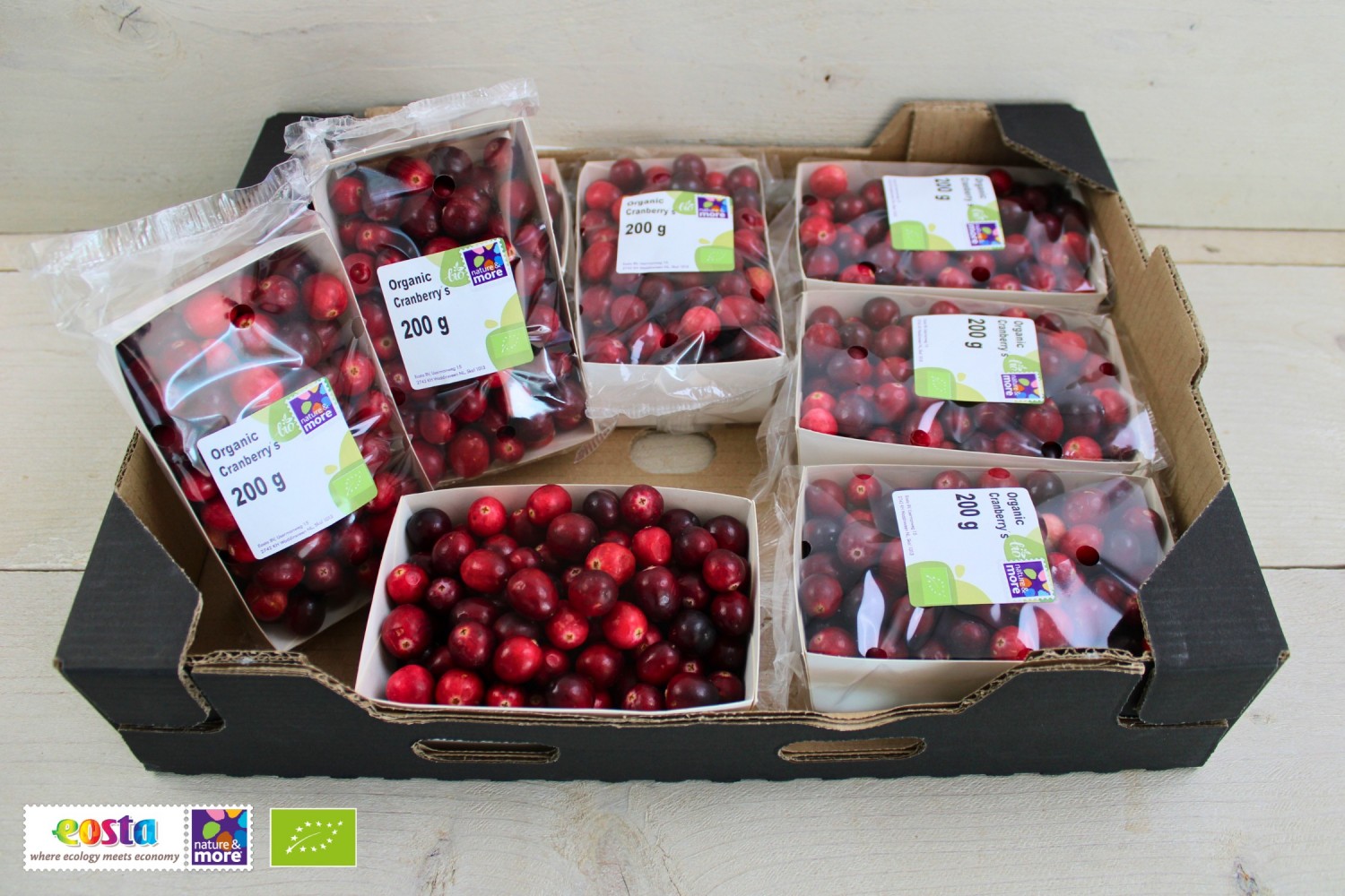 Les canneberges sont récoltées à sec, ce qui garantit des baies fermes, savoureuses et se conservant longtemps. Une nouvelle trieuse garantit en outre une qualité constante et élevée.