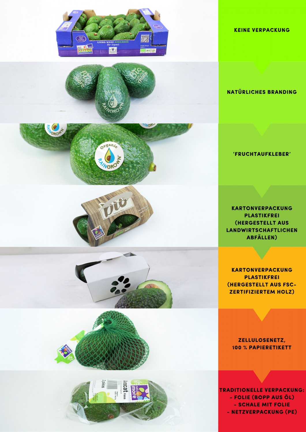 „Die beste Verpackung ist keine Verpackung,“ lautet das Motto unseres Verpackungsexperten Paul Hendriks. Unten finden Sie seinen Nachhaltigkeitsmesser für Verpackungen: von den nachhaltigsten Optionen (grün) bis hin zu weniger nachhaltigen Alternativen (orange und rot).